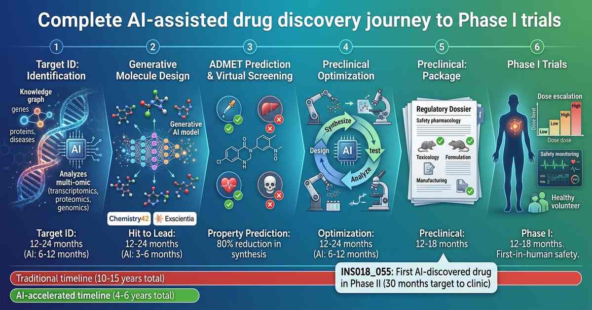 In 2023, Insilico announced that a molecule discovered entirely by AI—ISM001-055 for idiopathic pulmonary fibrosis—had entered Phase II clinical trials. The journey from target identification to Phase I completion took just 30 months and cost a fraction of traditional development. The molecule was designed, synthesized, and tested in animals entirely under AI guidance. This milestone demonstrated that AI could not just accelerate individual steps but compress the entire discovery pipeline.