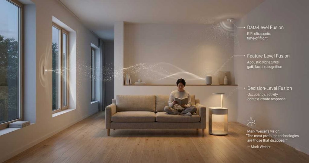At the highest level, inferences from multiple modalities combine to determine context and trigger actions. Occupancy detection (from PIR, cameras, acoustic sensors) fuses with activity recognition (from wearables, environmental sensors) to determine appropriate responses: lighting adjustment, climate control, audio routing, notification filtering. This level operates on seconds to minutes, often involving distributed processing across edge and cloud resources.