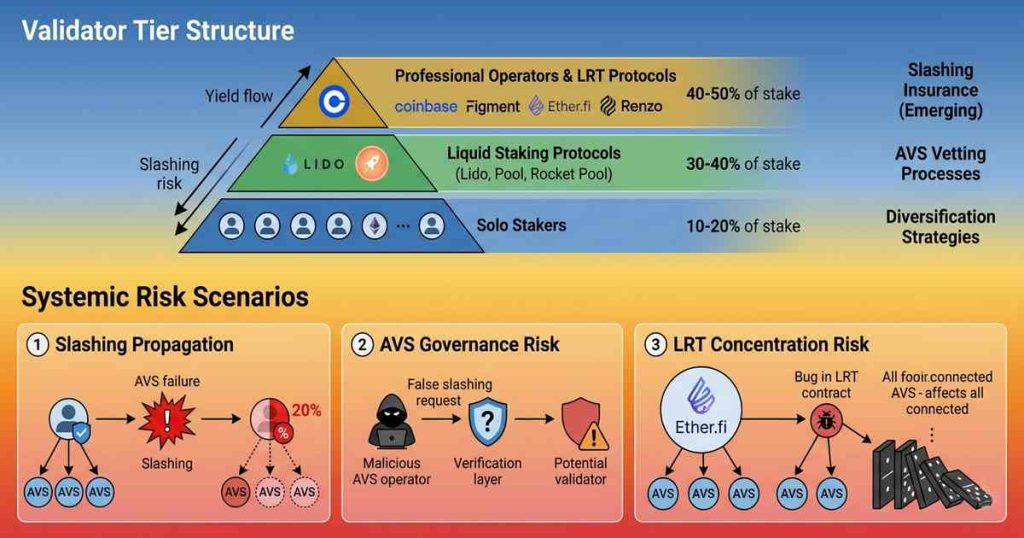 LRT protocols amplify systemic risk by concentrating deposits. A bug in an LRT protocol’s slashing management could affect thousands of depositors simultaneously. The failure of a major LRT protocol could trigger a cascade of withdrawals, destabilizing the AVS that rely on its restaked capital.